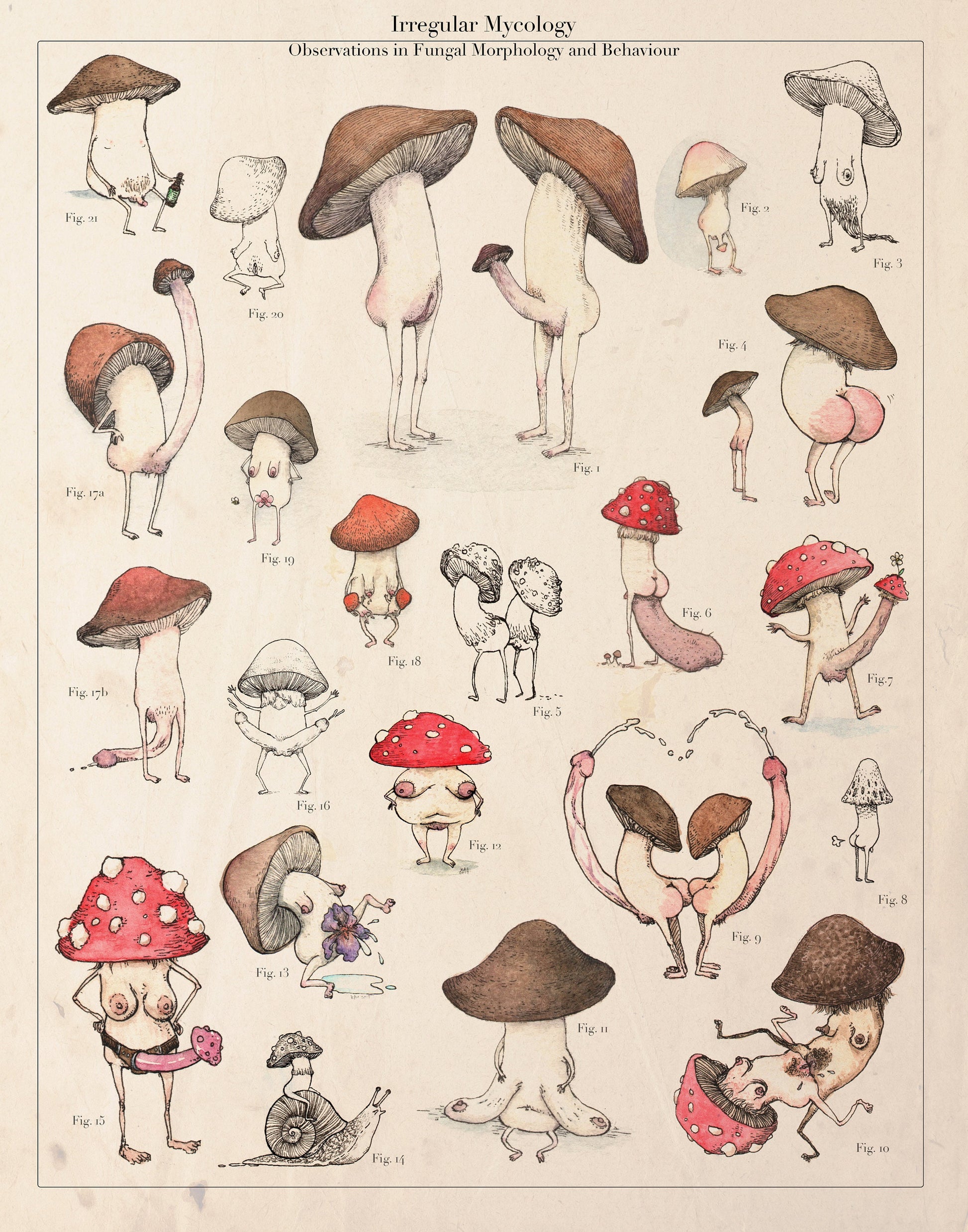 Observations in Fungal Morphology and Behavior. A poster collection of several illustrations, all depicting mushrooms engaged in natural, healthy adult behavior. Very NSFW, but makes a fun bathroom print! First image is censored, click through for full artwork.
